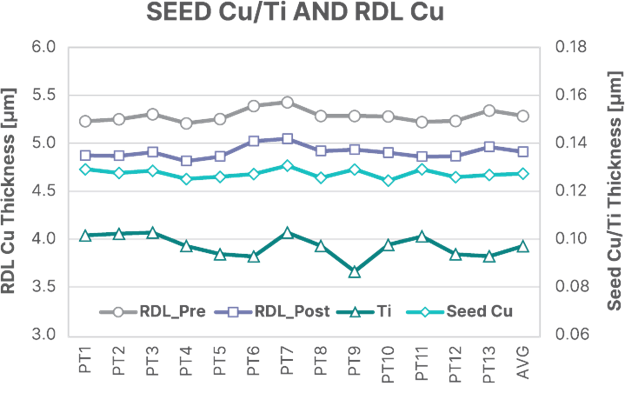 Fig. 3 offers an example of the signal from seed Cu/Ti measured in REF mode and Fig. 4 shows one from RDL in PSD mode. RDL thickness can be measured both in pre- and post-seed Cu removal; 13-point measurement results for seed Cu, Ti and RDL Cu are shown in Figure 5.