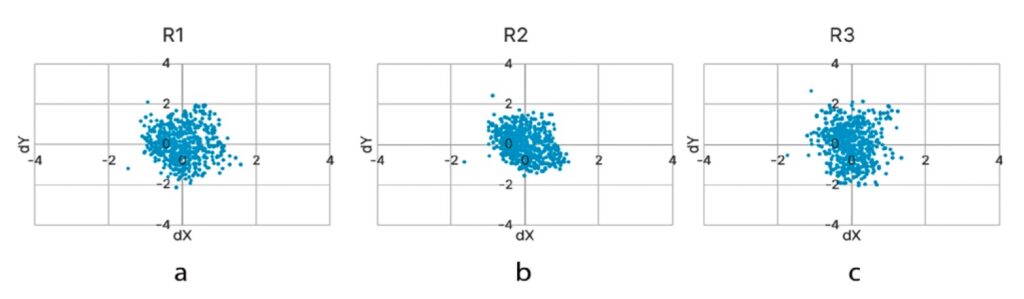 The lithography system (JetStep System, Onto Innovation) supports panel sizes up to 720mm x 600mm. It uses pattern recognition alignment, allowing the user to train the system to recognize and align on any unique pattern within the field of view. The alignment system can measure the X, Y position of die patterns across the panel, a process often referred to as “mapping.” The AOI system (Firefly System, Onto Innovation) uses a similar pattern recognition alignment method to assess die placement error. Using the stepper and AOI alignment site measurements from the test vehicle panel, a mathematical algorithm was applied to align the stepper and AOI coordinate systems. Once a common grid coordinate system was established, the stepper stage was considered as the reference and the AOI system was compared to this reference using simple scatter plots (Figure 3). The measurements were repeated three times to confirm repeatability. In all three cases, accuracy of the AOI system was within +/-2.3μm of the stepper reference. Figure 4 shows histograms of the dX and dY distributions for R1. Table 1 summarizes the statistical data for each run.