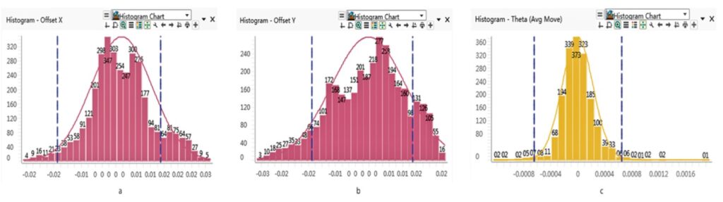 Figure 6: a) dX (mm), b) dY (mm), and c) rotation (rad) data histograms.