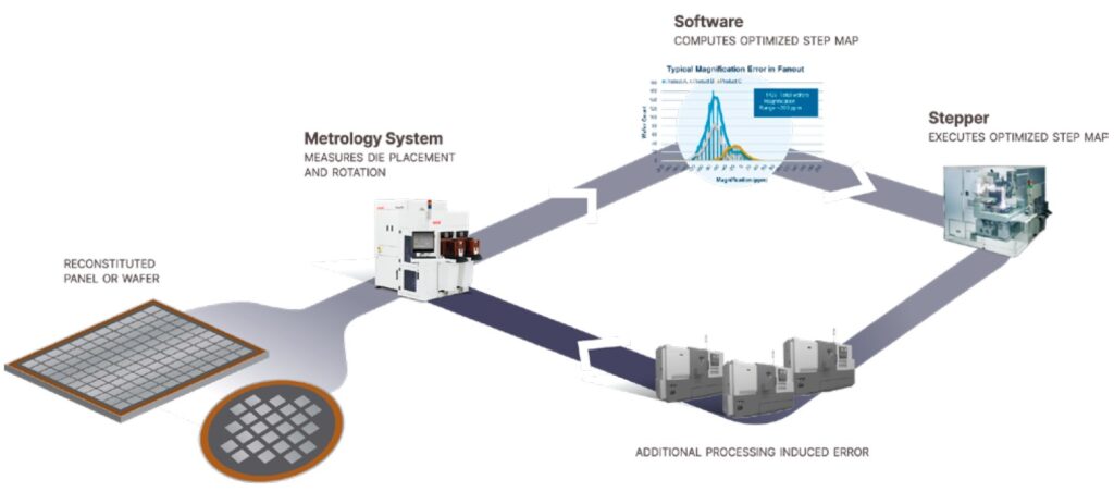 Although FOPLP processing has many advantages, it also faces significant challenges. One critical challenge is die placement error, which occurs when die are positioned during the reconstitution and molding process. These placement errors are amplified with the larger panel format when compared to reconstituted wafers, and errors of 50μm or more are not unusual. In order to guarantee acceptable yield, these errors must be corrected during the lithography process using site-by-site corrections. Conducting metrology and site-by-site exposures on the lithography system is very time consuming. Substrate alignment and error correction may be calculated using global alignment, but this correction does not accommodate nonlinear die placement errors. It has become clear that only site-by-site corrections can deliver the overlay required to maintain good yield. Executing site-by-site alignments in the stepper reduces throughput and increases cost enough to make that approach to FOPLP processes impractical. A new approach uses an external metrology tool to capture die placement error data from a panel and feeds that information forward. The “feed-forward” solution optimizes the stepper, site-by-site, for X, Y and rotation offsets, during exposure. Visualization of the metrology data allows the user to characterize upstream and downstream processes. Moreover, analytical capabilities predict yield as a function of exposure field size, thereby allowing the user to balance throughput against yield in real time. This solution can significantly increase stepper throughput, reduce cost and increase productivity while ensuring high yield.