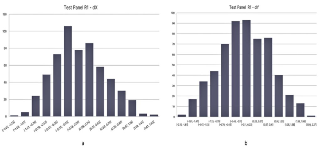 Figure 4: Test vehicle AOI error distributions R1 for a) dX, and b) dY.