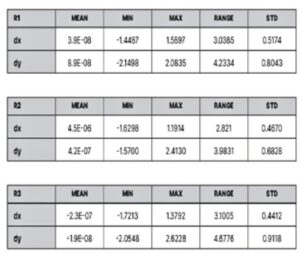 The lithography system (JetStep System, Onto Innovation) supports panel sizes up to 720mm x 600mm. It uses pattern recognition alignment, allowing the user to train the system to recognize and align on any unique pattern within the field of view. The alignment system can measure the X, Y position of die patterns across the panel, a process often referred to as “mapping.” The AOI system (Firefly System, Onto Innovation) uses a similar pattern recognition alignment method to assess die placement error. Using the stepper and AOI alignment site measurements from the test vehicle panel, a mathematical algorithm was applied to align the stepper and AOI coordinate systems. Once a common grid coordinate system was established, the stepper stage was considered as the reference and the AOI system was compared to this reference using simple scatter plots (Figure 3). The measurements were repeated three times to confirm repeatability. In all three cases, accuracy of the AOI system was within +/-2.3μm of the stepper reference. Figure 4 shows histograms of the dX and dY distributions for R1. Table 1 summarizes the statistical data for each run.