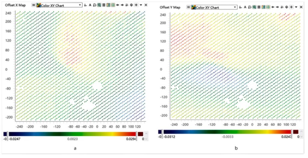 Figure 5: Die placement error (mm) a) dX, and b) dY heat maps.