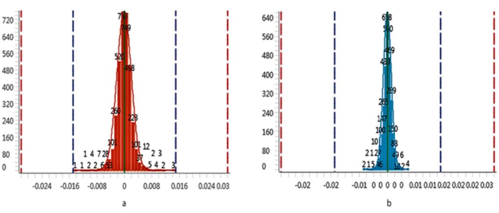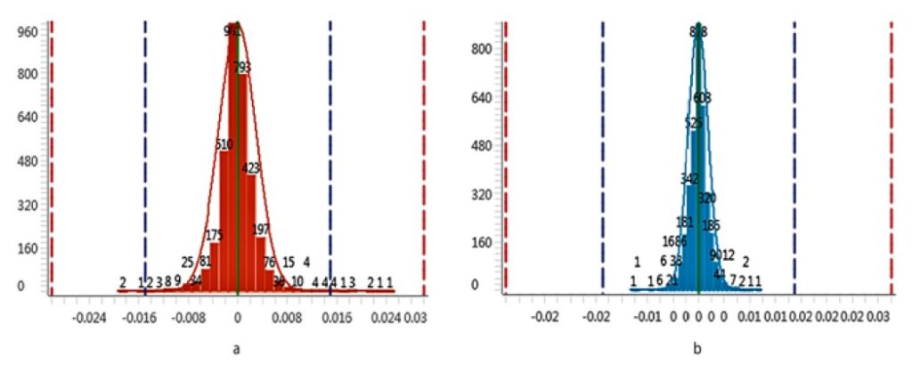 Figure 8: Predicted a) dX and b) dY overlay data histogram (mm) for 6×6 field size, where some die are out of