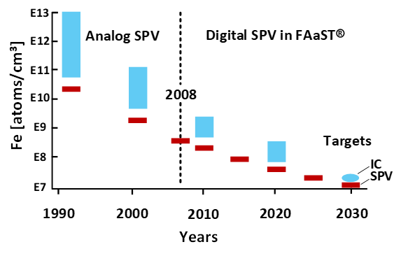 Figure 1. Typical background Fe concentration in new IC Fablines (blue) and the state-of-the-art SPV detection limit (red)